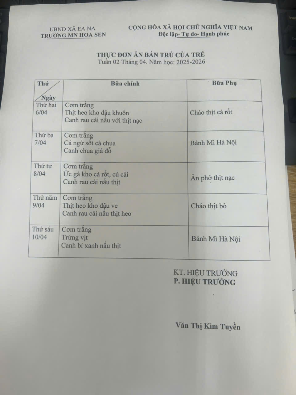 3. Thực đơn tuần 2( từ 6-10/ 4/2026)
